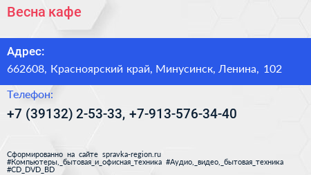 Весна, кафе по адресу 662608, Красноярский край, Минусинск, Ленина, 102 в дальнейшем Организация, размещена в следующих категориях: