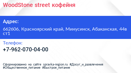 WoodStone street, кофейня по адресу 662606, Красноярский край, Минусинск, Абаканская, 44в ст1 в дальнейшем Организация, размещена в следующих категориях: