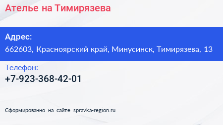 Ателье на Тимирязева по адресу 662603, Красноярский край, Минусинск, Тимирязева, 13 в дальнейшем Организация, размещена в следующих категориях: