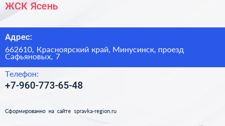 ЖСК Ясень по адресу 662610, Красноярский край, Минусинск, проезд Сафьяновых, 7 в дальнейшем Организация, размещена в следующих категориях: