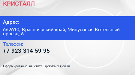 КРИСТАЛЛ по адресу 662610, Красноярский край, Минусинск, Котельный проезд, 6 в дальнейшем Организация, размещена в следующих категориях: