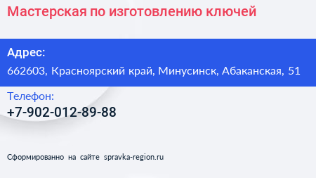 Мастерская по изготовлению ключей по адресу 662603, Красноярский край, Минусинск, Абаканская, 51 в дальнейшем Организация, размещена в следующих категориях: