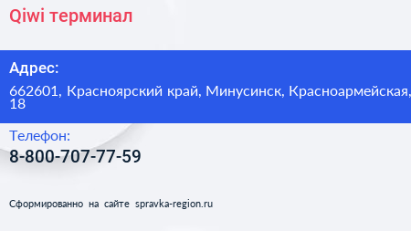 Qiwi, терминал по адресу 662601, Красноярский край, Минусинск, Красноармейская, 18 в дальнейшем Организация, размещена в следующих категориях: