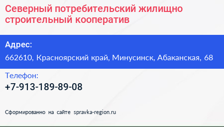 Северный, потребительский жилищно-строительный кооператив по адресу 662610, Красноярский край, Минусинск, Абаканская, 68 в дальнейшем Организация, размещена в следующих категориях: