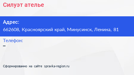 Силуэт, ателье по адресу 662608, Красноярский край, Минусинск, Ленина, 81 в дальнейшем Организация, размещена в следующих категориях: