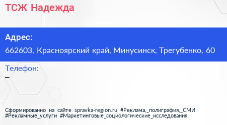 ТСЖ Надежда+ по адресу 662603, Красноярский край, Минусинск, Трегубенко, 60 в дальнейшем Организация, размещена в следующих категориях: