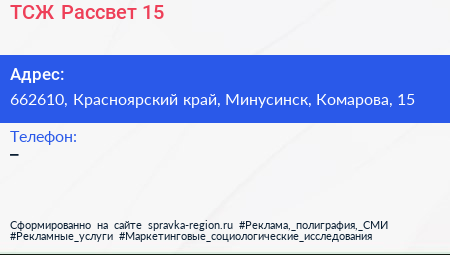 ТСЖ Рассвет 15 по адресу 662610, Красноярский край, Минусинск, Комарова, 15 в дальнейшем Организация, размещена в следующих категориях: