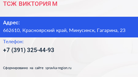 ТСЖ ВИКТОРИЯ-М по адресу 662610, Красноярский край, Минусинск, Гагарина, 23 в дальнейшем Организация, размещена в следующих категориях: