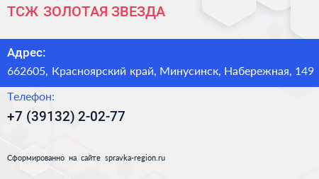 ТСЖ ЗОЛОТАЯ ЗВЕЗДА по адресу 662605, Красноярский край, Минусинск, Набережная, 149 в дальнейшем Организация, размещена в следующих категориях: