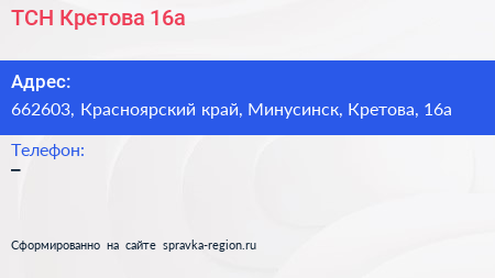 ТСН Кретова 16а по адресу 662603, Красноярский край, Минусинск, Кретова, 16а в дальнейшем Организация, размещена в следующих категориях: