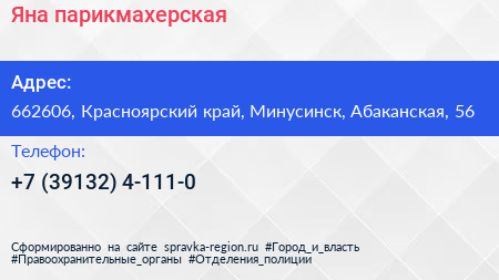 Яна, парикмахерская по адресу 662606, Красноярский край, Минусинск, Абаканская, 56 в дальнейшем Организация, размещена в следующих категориях: