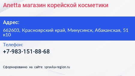 Anetta, магазин корейской косметики по адресу 662603, Красноярский край, Минусинск, Абаканская, 51 к10 в дальнейшем Организация, размещена в следующих категориях: