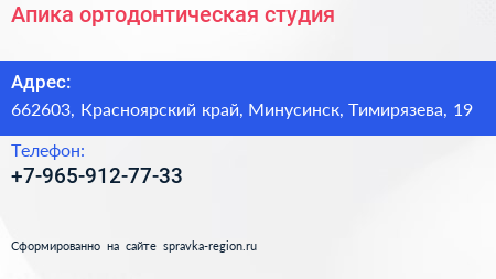 Апика, ортодонтическая студия по адресу 662603, Красноярский край, Минусинск, Тимирязева, 19 в дальнейшем Организация, размещена в следующих категориях: