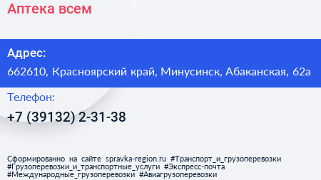 Аптека всем по адресу 662610, Красноярский край, Минусинск, Абаканская, 62а в дальнейшем Организация, размещена в следующих категориях: