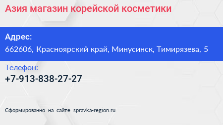 Азия, магазин корейской косметики по адресу 662606, Красноярский край, Минусинск, Тимирязева, 5 в дальнейшем Организация, размещена в следующих категориях: