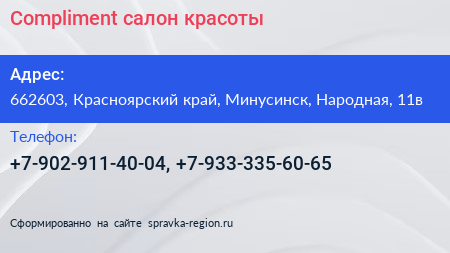 Compliment, салон красоты по адресу 662603, Красноярский край, Минусинск, Народная, 11в в дальнейшем Организация, размещена в следующих категориях: