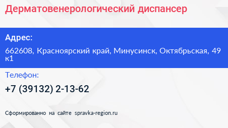 Дерматовенерологический диспансер по адресу 662608, Красноярский край, Минусинск, Октябрьская, 49 к1 в дальнейшем Организация, размещена в следующих категориях: