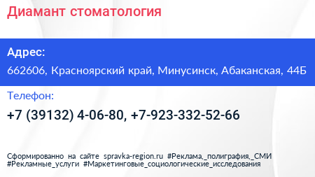 Диамант, стоматология по адресу 662606, Красноярский край, Минусинск, Абаканская, 44Б в дальнейшем Организация, размещена в следующих категориях: