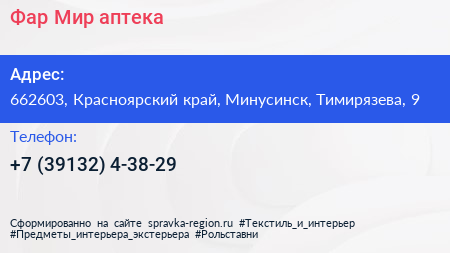 Фар Мир, аптека по адресу 662603, Красноярский край, Минусинск, Тимирязева, 9 в дальнейшем Организация, размещена в следующих категориях: