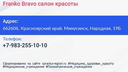 Franko Bravo, салон красоты по адресу 662606, Красноярский край, Минусинск, Народная, 19Б в дальнейшем Организация, размещена в следующих категориях: