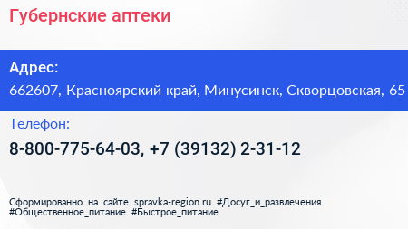 Губернские аптеки по адресу 662607, Красноярский край, Минусинск, Скворцовская, 65 в дальнейшем Организация, размещена в следующих категориях: