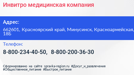Инвитро, медицинская компания по адресу 662601, Красноярский край, Минусинск, Красноармейская, 18Б в дальнейшем Организация, размещена в следующих категориях:
