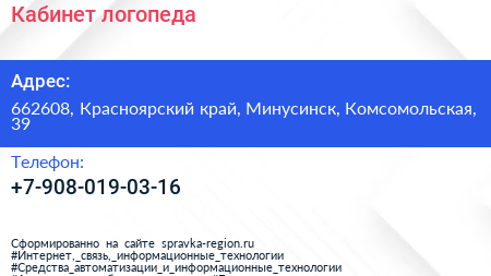 Кабинет логопеда по адресу 662608, Красноярский край, Минусинск, Комсомольская, 39 в дальнейшем Организация, размещена в следующих категориях: