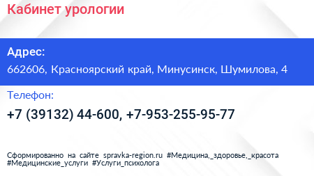 Кабинет урологии по адресу 662606, Красноярский край, Минусинск, Шумилова, 4 в дальнейшем Организация, размещена в следующих категориях: