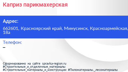 Каприз, парикмахерская по адресу 662601, Красноярский край, Минусинск, Красноармейская, 18а в дальнейшем Организация, размещена в следующих категориях: