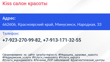 Kiss, салон красоты по адресу 662606, Красноярский край, Минусинск, Народная, 33 в дальнейшем Организация, размещена в следующих категориях: