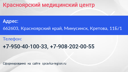 Красноярский медицинский центр по адресу 662603, Красноярский край, Минусинск, Кретова, 11Б/1 в дальнейшем Организация, размещена в следующих категориях: