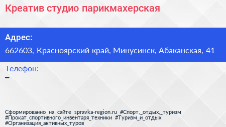 Креатив-студио, парикмахерская по адресу 662603, Красноярский край, Минусинск, Абаканская, 41 в дальнейшем Организация, размещена в следующих категориях: