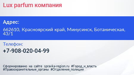 Lux parfum, компания по адресу 662610, Красноярский край, Минусинск, Ботаническая, 43/1 в дальнейшем Организация, размещена в следующих категориях: