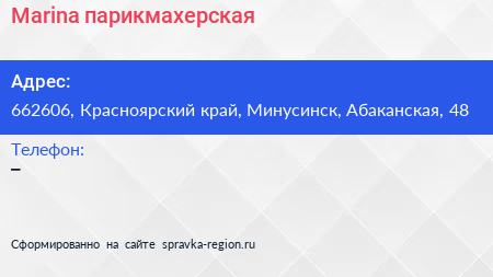 Marina, парикмахерская по адресу 662606, Красноярский край, Минусинск, Абаканская, 48 в дальнейшем Организация, размещена в следующих категориях: