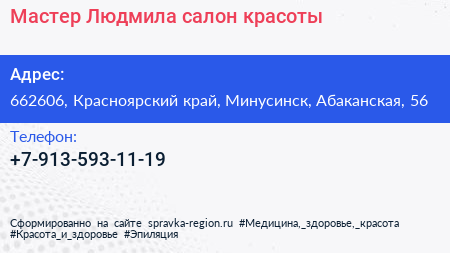 Мастер Людмила, салон красоты по адресу 662606, Красноярский край, Минусинск, Абаканская, 56 в дальнейшем Организация, размещена в следующих категориях: