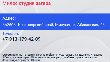 Милос, студия загара по адресу 662606, Красноярский край, Минусинск, Абаканская, 46 в дальнейшем Организация, размещена в следующих категориях: