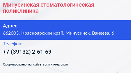 Минусинская стоматологическая поликлиника по адресу 662603, Красноярский край, Минусинск, Ванеева, 6 в дальнейшем Организация, размещена в следующих категориях: