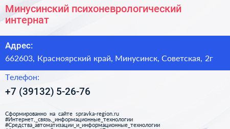 Минусинский психоневрологический интернат по адресу 662603, Красноярский край, Минусинск, Советская, 2г в дальнейшем Организация, размещена в следующих категориях: