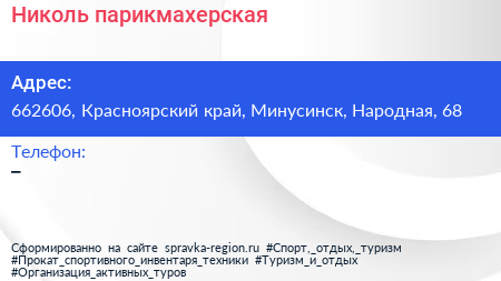 Николь, парикмахерская по адресу 662606, Красноярский край, Минусинск, Народная, 68 в дальнейшем Организация, размещена в следующих категориях: