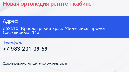 Новая ортопедия, рентген-кабинет по адресу 662610, Красноярский край, Минусинск, проезд Сафьяновых, 11а в дальнейшем Организация, размещена в следующих категориях: