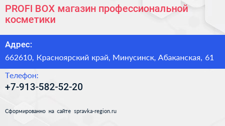 PROFI BOX, магазин профессиональной косметики по адресу 662610, Красноярский край, Минусинск, Абаканская, 61 в дальнейшем Организация, размещена в следующих категориях: