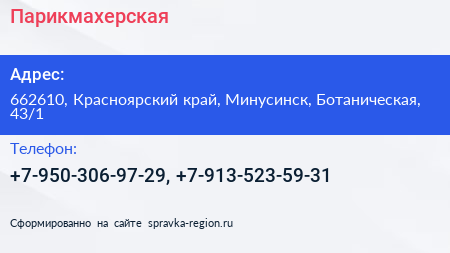 Парикмахерская по адресу 662610, Красноярский край, Минусинск, Ботаническая, 43/1 в дальнейшем Организация, размещена в следующих категориях: