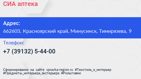 СИА, аптека по адресу 662603, Красноярский край, Минусинск, Тимирязева, 9 в дальнейшем Организация, размещена в следующих категориях: