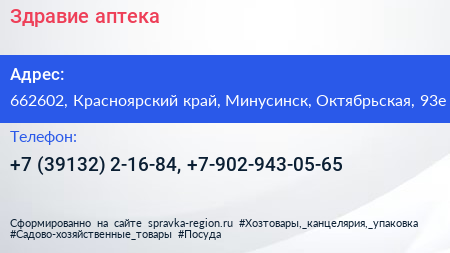 Здравие, аптека по адресу 662602, Красноярский край, Минусинск, Октябрьская, 93е в дальнейшем Организация, размещена в следующих категориях: