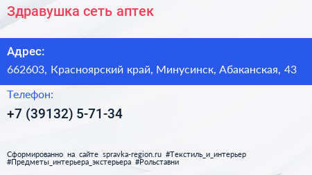 Здравушка, сеть аптек по адресу 662603, Красноярский край, Минусинск, Абаканская, 43 в дальнейшем Организация, размещена в следующих категориях: