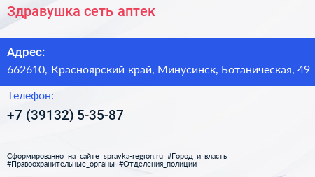 Здравушка, сеть аптек по адресу 662610, Красноярский край, Минусинск, Ботаническая, 49 в дальнейшем Организация, размещена в следующих категориях: