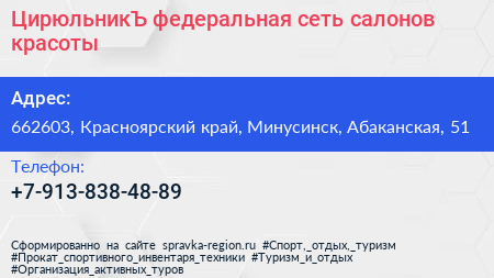 ЦирюльникЪ, федеральная сеть салонов красоты по адресу 662603, Красноярский край, Минусинск, Абаканская, 51 в дальнейшем Организация, размещена в следующих категориях:
