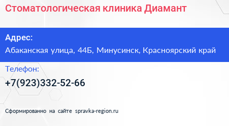 Стоматологическая клиника «Диамант» по адресу Абаканская улица, 44Б, Минусинск, Красноярский край в дальнейшем Организация, размещена в следующих категориях: