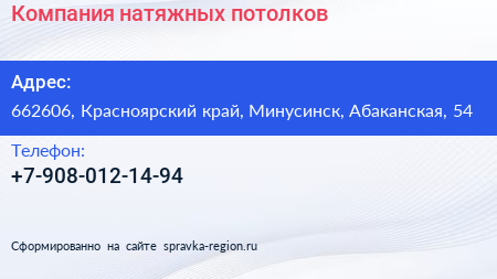 Компания натяжных потолков по адресу 662606, Красноярский край, Минусинск, Абаканская, 54 в дальнейшем Организация, размещена в следующих категориях: