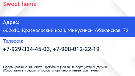Sweet home по адресу 662610, Красноярский край, Минусинск, Абаканская, 72 в дальнейшем Организация, размещена в следующих категориях: